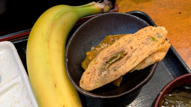 - 定食には玉子焼き・かぼちゃ煮・ご飯・お味噌汁・ふりかけ・バナナが付いてきて、ボリューミーだが栄養バランスは良い。