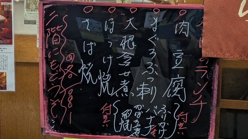 店頭のメニューを見ますと、肉豆腐にマグロ、焼き魚などの定食が千円ポッキリ。