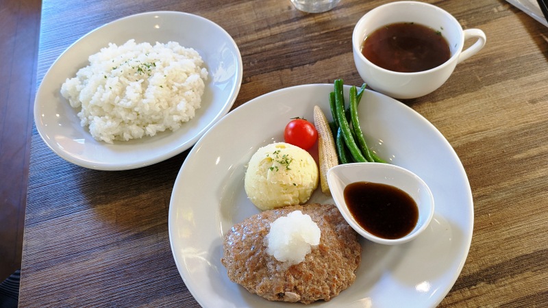 切るとね、じゅわっと肉汁の出るジューシーなハンバーグでしたよ。ふわっとやさしい感じでつくられていて、食感もソフトな感じ。