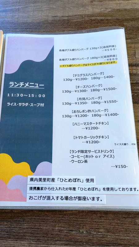 大きさは130gと180gがあり、しかもそれぞれダブル盛り、つまり2枚重ねもできます。最大で360gのハンバーグを堪能できるってこと。
