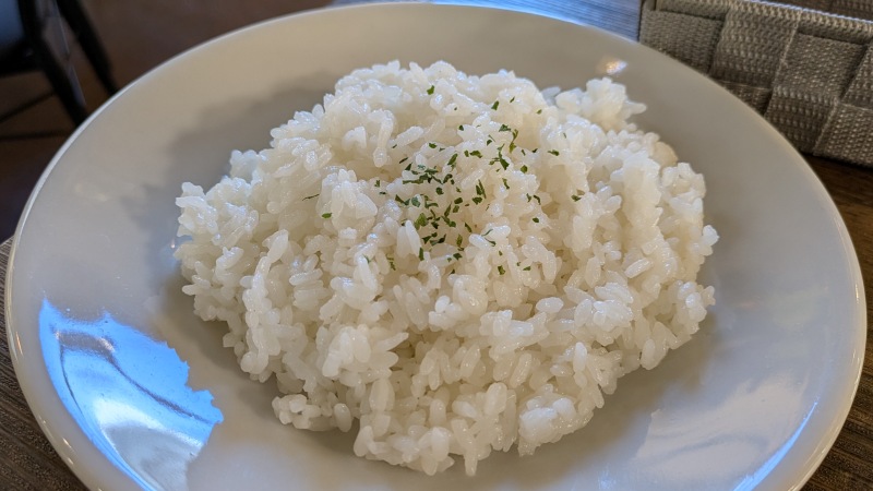 ライスもボリューミー、220gくらいはあるんじゃないでしょうか。