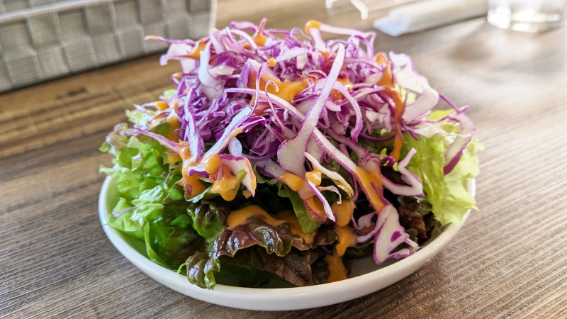 シャキシャキのレタスに紫キャベツなど。そして自家製なのでしょうか、少し酸味の効いたドレッシング、美味しかったですよ。