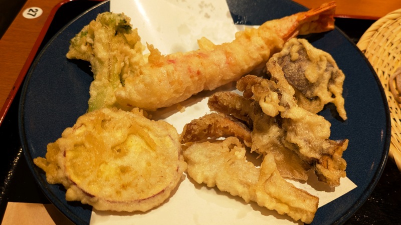 名前からして、ざるそばに大きな海老と穴子と舞茸の天ぷらが付いてくるんだろーなー、と想像していましたけど、天ぷら、思ったよりいろいろあります。